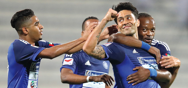 لاعبو النصر يحتفلون مع خيمينيز صاحب الهدفين من الخماسية في بني ياس. تصوير: أسامة أبوغانم