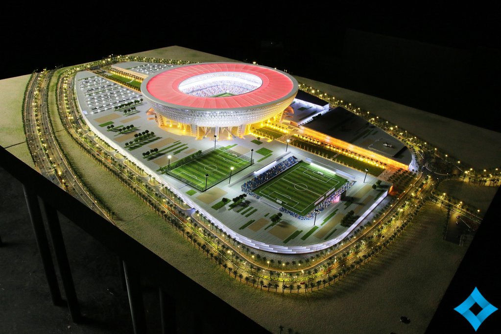 ومن بين عشرات الشركات العالمية العاملة في مجال تصميم المباني الرياضية على مستوى العالم تم اختيار شركة دار الهندسة والاستشاري المعماري العالمي بيركينز بلس ويل لتنفيذ المشروع الذي يضم استاد يتسع لأكثر من 60 ألف متفرج منها 23116 مقعدا للمدرجات العلوية و1642 مقعدا لجناح كبار الشخصيات و 8941 مقعدا لمدرجات كبار الشخصيات و6688 مقعدا للمدرجات السفلية كما يضم مباني رياضية تشمل ملعب إحماء وقاعة تدريب رياضي ومواقف تتسع لـ 5000 مركبة ومتحفاً رياضياً على مساحة 1500 متر مربع وقاعة متعددة الأغراض على مساحة 3500 متر مربع ومرافق للمؤتمرات والمعارض وشرفات تسمح للمتفرجين بالانتظار والتفاعل مع الأجواء المحيطة ويضم المشروع كذلك الممر الطولي الذي يشمل محلات تجارية ومطاعم تلبي احتياجات الجمهور ومرتادي الموقع.