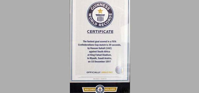 تسلّم عضو مجلس إدارة شركة النصر لكرة القدم ولاعب النصر ومنتخب الإمارات السابق حسن سهيل، بحسب بيان صحافي صادرعن نادي النصر، أمس، شهادة من موسوعة غينيس للأرقام القياسية، بمناسبة تسجيله أسرع هدف في تاريخ كأس العالم للقارات، بعد أن كان قد سجل الهدف في مرمى جنوب إفريقيا، خلال المباراة التي أقيمت ضمن بطولة عام 1997، وجرت في السعودية.