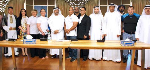 ناصر آل رحمة وعارف ميرزا مع أبطال اللياقة البدنية والمنظمين. من المصدر