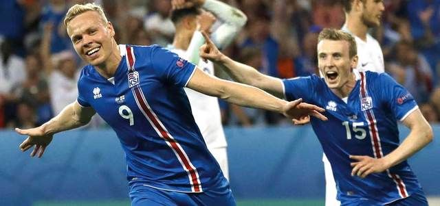فرحة تاريخية للاعبي آيسلندا بعد المفاجأة المدوية وإخراج إنجلترا من بطولة أوروبا. أ.ب