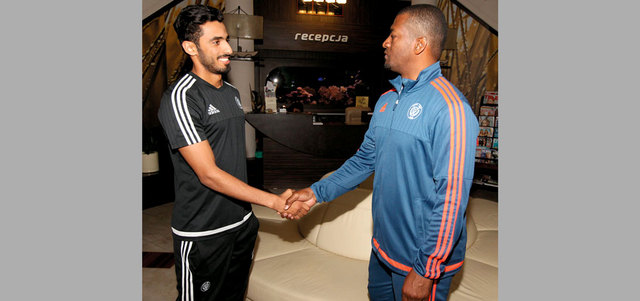 رئيس بعثة النصر حسن سهيل خلال استقبال اللاعب فواز عوانة في معسكر بولندا. من المصدر