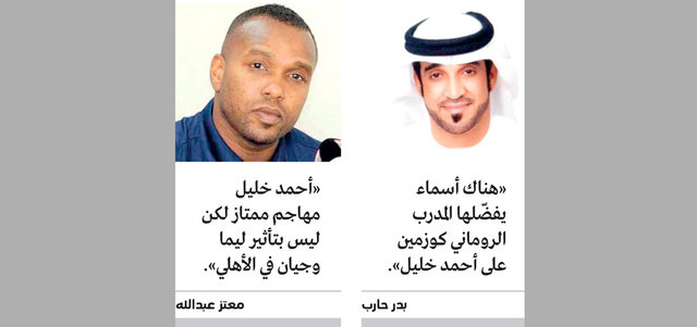 وقالوا لـ«الإمارات اليوم» إن «أحمد خليل الملقب بـ(الغزال الأسمر) لاعب ضمن منظومة الأهلي، لكنه ليس مصدر التأثير الوحيد في فريقه، فهناك أسماء سيفضلها المدرب الروماني أولاريو كوزمين عليه، أمثال البرتغالي ليما والغاني أسامواه جيان، ما يقلص فرصة مشاركته لمدة زمنية معقولة في المباريات». وأكد اللاعب الدولي السابق عبدالرحمن محمد أن «علي مبخوت هو الأكثر تأثيراً على فريقه، على العكس من أحمد خليل مع الأهلي، وهذا الأمر في الواقع عكسته استراتيجية لعب كلا من المدربين كوزمين في الأهلي، وتين كات في الجزيرة، فالأول يعتمد على مهاجم واحد في معظم المباريات، وربما لو تغيرت استراتيجية لعب المدرب الروماني، والاعتماد على طريقة 4-4-2 سيكون لخليل دور أكثر فاعلية في الأهلي».