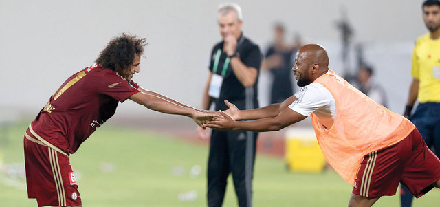 سهيل المنصوري (يسار) يتلقى تهنئة إسماعيل مطر بعد تسجيله في شباك الجزيرة. تصوير: إريك أرازاس