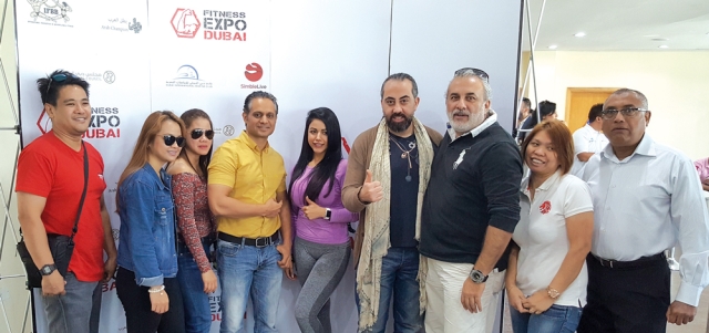عارف ميرزا يتوسط عدداً من ممثلي الشركات العارضة في «إكسبو دبي» للياقة البدنية. من المصدر