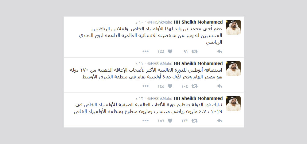 قال صاحب السمو الشيخ محمد بن راشد آل مكتوم نائب رئيس الدولة رئيس مجلس الوزراء حاكم دبي، في حسابه على موقع التواصل الاجتماعي "تويتر"،" نبارك فوز الدولة بتنظيم دورة الألعاب العالمية الصيفية للأولمبياد الخاص في 2019 ، 4.7 مليون رياضي منتسب ومليون متطوع بمنظمة الأولمبياد الخاص".