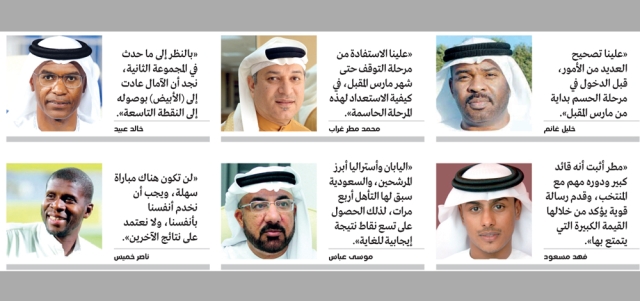 بدوره، شدد عضو لجنة المسابقات في اتحاد الكرة، خالد عبيد، على أن التوقعات قبل انطلاق المرحلة الحاسمة، كانت بالحصول على عدد أكبر من تسع نقاط، لكن بالنظر إلى ما حدث في المجموعة الثانية، نجد أن الآمال عادت إلى «الأبيض» مجدداً.