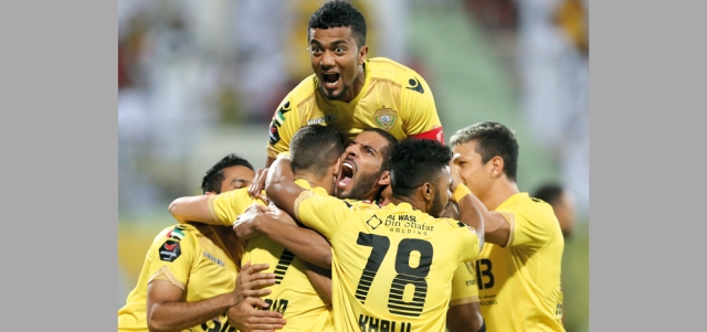 فرحة كبيرة للاعبي الوصل بعد الفوز الكبير على بني ياس أمس. تصوير: أسامة أبوغانم