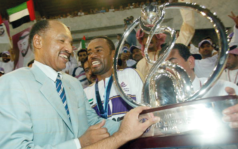 الرئيس السابق للاتحاد الآسيوي محمد بن همام خلال تسليم كأس 2003 لفريق العين. أرشيفية ـــ أ.ف.ب