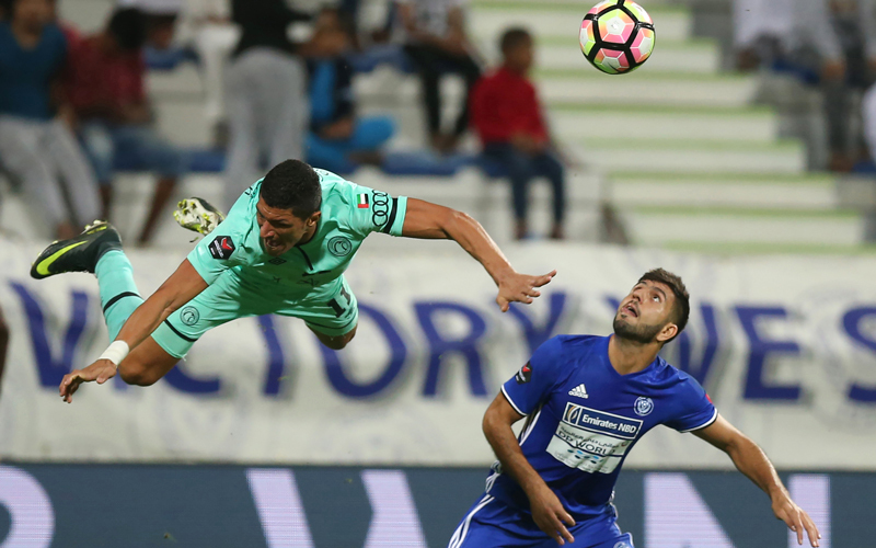 مهاجم الشباب لوفانور يطير في الهواء خلال احتكاك مع مهاجم النصر مهند. تصوير: أسامة أبوغانم
