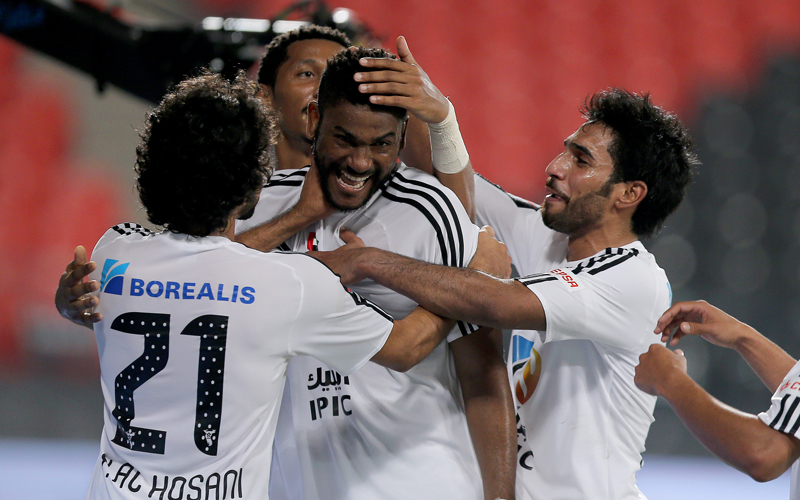 لاعبو الجزيرة يحتفلون بالفوز مع فارس جمعة. تصوير: إريك أرازاس