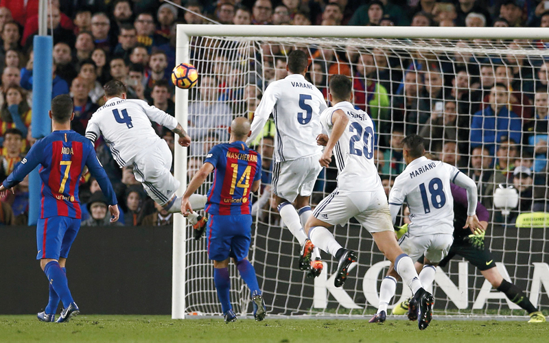 راموس يمارس هوايته في التحليق والتسجيل بالدقائق الأخيرة. رويترز