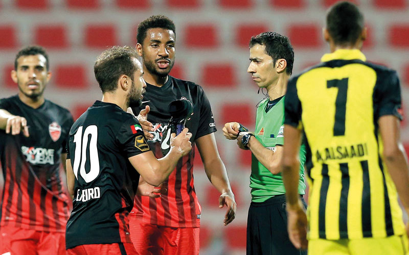 ريبيرو يحتجّ على الحكم الكسار خلال لقاء الأهلي وكلباء. تصوير: باتريك كاستيلو