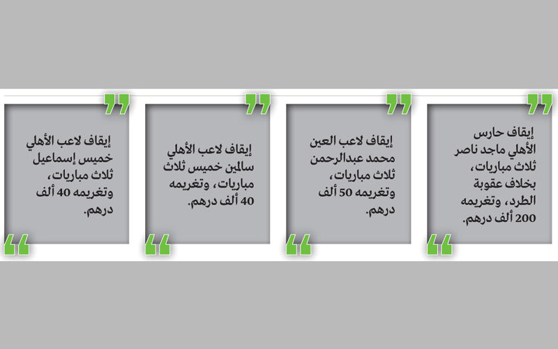 كما عاقبت اللجنة لاعب العين محمد عبدالرحمن بالإيقاف ثلاث مباريات، وتغريمه 50 ألف درهم، وتغريم العين 100 ألف درهم، بسبب تصرف جمهوره برشقه حافلة لاعبي الأهلي، وتمت معاقبة لاعب الأهلي سالمين خميس بالإيقاف ثلاث مباريات، وتغريمه 40 ألف درهم، وكذلك إيقاف لاعب الأهلي خميس إسماعيل ثلاث مباريات وتغريمه 40 ألف درهم، وتغريم الأهلي 10 آلاف درهم.