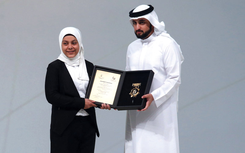 أحمد بن محمد يسلم سارة سمير جائزة الإبداع الرياضي عن فئة رياضي حقق إنجازاً رفيع المستوى. تصوير: أسامة أبوغانم