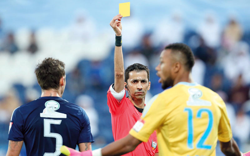 فهد الكسار يشهر البطاقة الصفراء لحارس بني ياس أحمد ديدا. تصوير: نجيب محمد