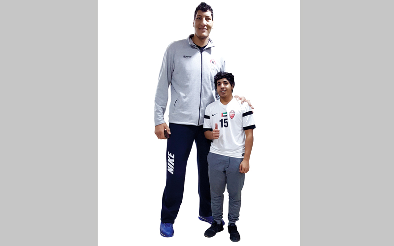 لاعب فريق الأهلي لكرة اليد منصور النيادي في صورة تذكارية مع عملاق السلة المصرية. من المصدر