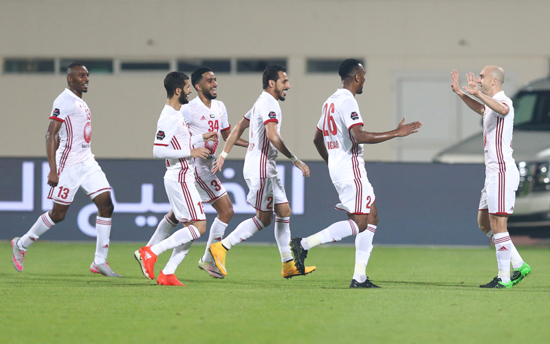 لاعبو الشارقة يحتفلون بالفوز على كلباء. تصوير: أسامة أبوغانم