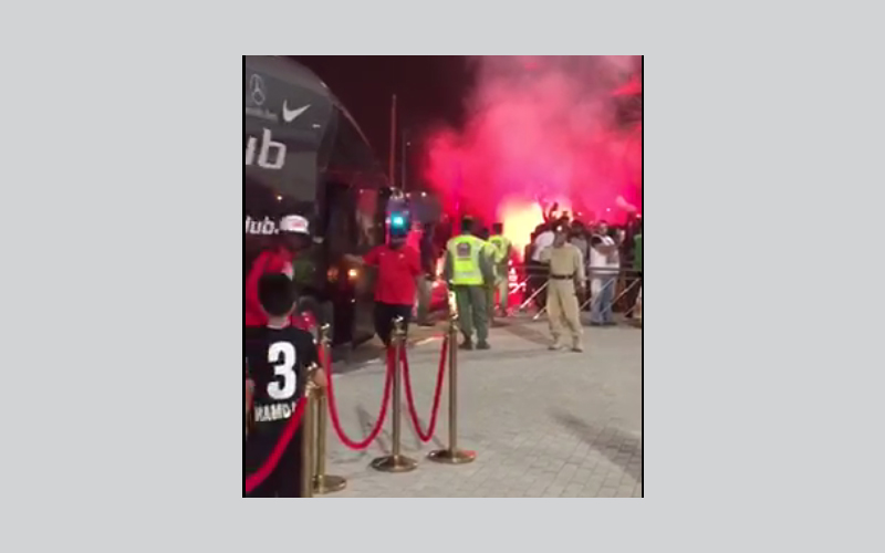 استقبل جمهور نادي الأهلي حافلة "الفرسان" بالألعاب النارية لحظة وصول الفريق إلى استاد راشد، استعداداً لمواجهة التعاون السعودي اليوم في دوري أبطال آسيا.