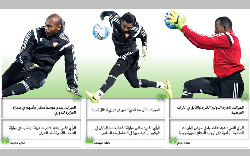 وتشكل المنافسة والتألق المستمر للحراس الثلاثة الذين اختارهم مدرب «الأبيض»، مهدي علي، وهم حارس مرمى الجزيرة علي خصيف، وحارس الأهلي ماجد ناصر، وحارس العين خالد عيسى، مصدر حيرة بالنسبة للمدرب في اختيار الاسم الذي يتولى حراسة مرمى الأبيض في مواجهة «الساموراي».
