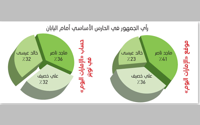 وتفوق ماجد ناصر في نتيجة استفتاء الموقع الإلكتروني بحصوله على نسبة 41% من مجموع الأصوات، مقابل حلول علي خصيف في المركز الثاني بحصوله على 36%، بينما جاء في المركز الثالث خالد عيسى بنسبة 23%، في المقابل أظهر استفتاء موقع التواصل الاجتماعي «تويتر» تفوق علي خصيف بنسبة 36%، مقابل تساوي ماجد ناصر وخالد عيسى بالنسبة نفسها 32%.