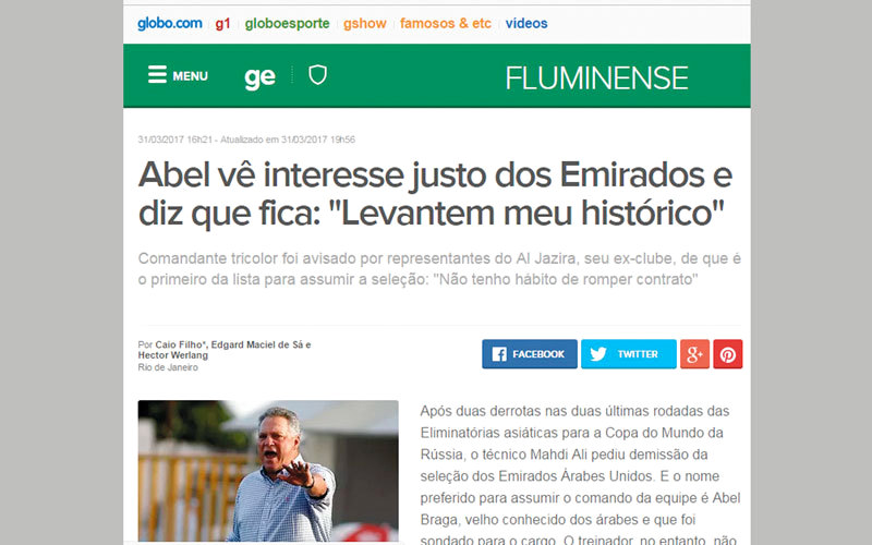 وأضافت: «ارتباطه بعقد مع فلومينينسي قد يصبح العائق الوحيد لرحيله إلى الإمارات، خصوصاً مع النتائج الجيدة التي يحققها مع النادي البرازيلي».