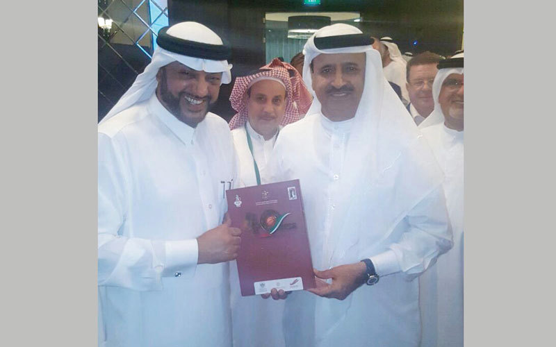 القرقاوي يهدي طلال بن بدر كتاب تاريخ السلة الإماراتية. من المصدر