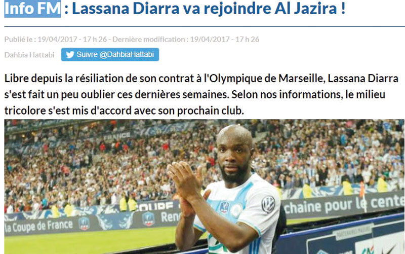ادعى موقعا «فوتبول ميركاتو» الفرنسي و«فوتبول ترانسيفرت» في النسخة الألمانية، أن نجم الكرة الفرنسية، المخضرم لاسانا ديارا، وقّع عقداً مع نادي الجزيرة متصدر ترتيب دوري الخليج العربي لكرة القدم حالياً، لمدة ثلاث سنوات، وأن الإعلان الرسمي على الصفقة سيكون خلال الفترة المقبلة، وأشارا إلى أن ديارا كان من دون نادٍ حتى وجد عرض نادي الجزيرة. وقال موقع «فوتبول ميركاتو»: «تؤكد معلوماتنا أن ديارا وقّع بالفعل مع النادي الإماراتي، وسيرتدي قميص ناديه الجديد بداية من الموسم المقبل لمدة ثلاث سنوات، وأن اللعب مع نادي الجزيرة سيكون التحدي الجديد أمام اللاعب الذي خاض تحديات في فرنسا وإنجلترا وإسبانيا خلال مسيرته السابقة».