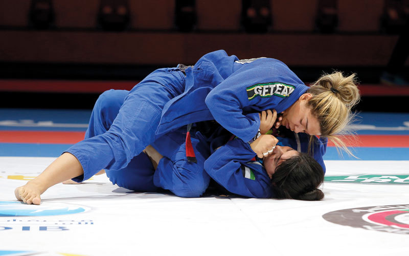 اللاعبتان البرازيليتان بريسيلا سيركويرا وسابرينا دي سوزا أمس خلال نزال نصف نهائي السيدات لوزن 70 كغم ضمن بطولة أبوظبي لمحترفي رياضة الجوجيتسو التي تقام على صالة إيبيك.