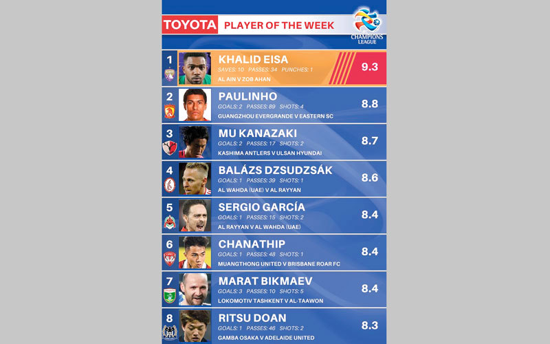 حصل حارس مرمى فريق العين، خالد عيسى، على جائزة لاعب «تويوتا» كأفضل لاعب في الجولة الخامسة من دوري أبطال آسيا لكرة القدم، بعد المستويات القوية التي قدمها خلال مباراة فريقه مع ذوب آهن الإيراني (3-صفر) يوم الإثنين الماضي، ضمن المجموعة الثالثة، والتي شهدت تصديه لركلة جزاء في الوقت المحتسب بدل الضائع من الشوط الأول، كانت نقطة التحول في المباراة. وحصل عيسى الذي توج بلقب أفضل لاعب في ذات المباراة، على أعلى معدل نقاط بنسبة 9.3 نقاط، متفوقاً على لاعب جوانجزو الصيني، والبرازيلي باولينيو، الذي حصل على 8.8 نقاط، ولاعب كاشيما الياباني كانازاكي الذي حل ثالثاً بحصوله على 8.7 نقاط، فيما جاء لاعب الوحدة، المجري، بلاس جوجاك، في المركز الرابع بمعدل 8.9 نقلط، كما اختار الاتحاد الآسيوي، الحارس خالد عيسى، في التشكيلة الرسمية للجولة الخامسة.