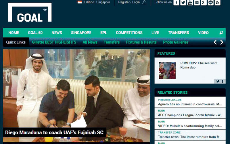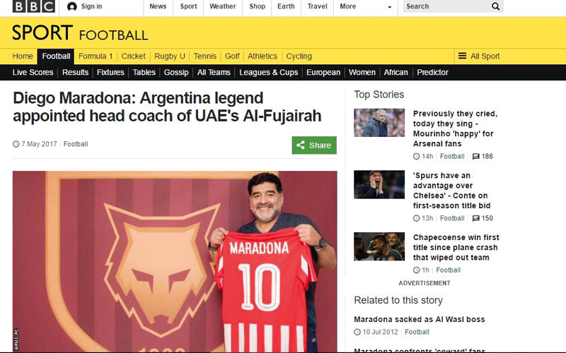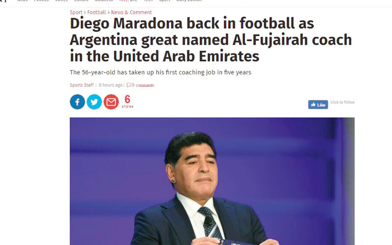 اهتمت وسائل الإعلام العالمية بتعاقد نادي الفجيرة مع أسطورة كرة القدم، الأرجنتيني دييغو أرماندو مارادونا، بعد خمس سنوات من توقفه عن العمل في الملاعب، منذ تدريب الوصل في 2012.