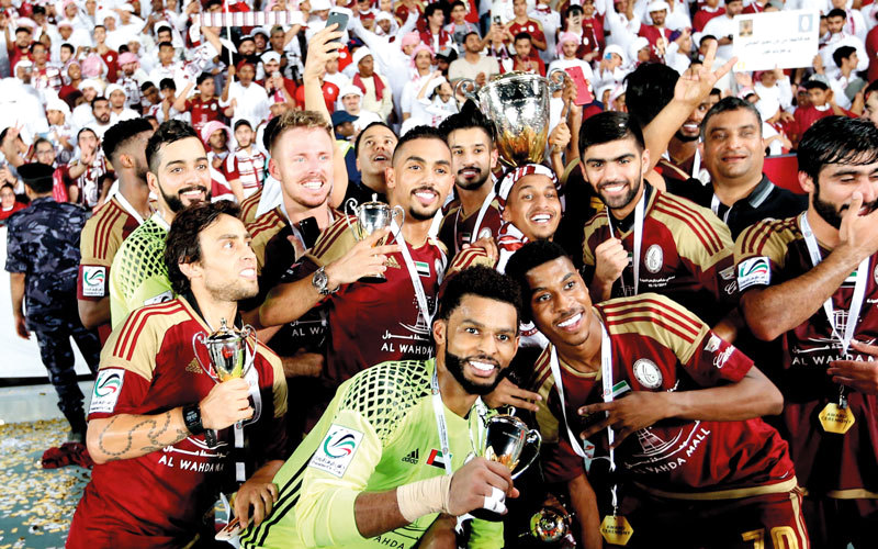 نجوم الوحدة يحتفلون بكأس رئيس الدولة وتذكرة التأهل لدوري أبطال آسيا. تصوير: نجيب محمد