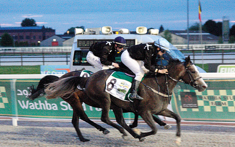 نجحت المهرة «منيرة» للنجيفي ريسنج، وبإشراف دايمين وتريجانت، وبقيادة الفارس كريستوفر سوميلون، في انتزاع لقب الجولة الثالثة من كأس الوثبة ستاليونز لمسافة 1900 متر، الذي أقيم أول من أمس بمضمار لاتست دي بوش بفرنسا. وأقيم السباق ضمن النسخة التاسعة لمهرجان سمو الشيخ منصور بن زايد آل نهيان العالمي للخيول العربية الأصيلة، حتى وصل عددها هذا العام لأكثر من 50 سباقاً محلياً وفي أوروبا وأميركا. وشارك في السباق المخصص للخيول العربية الأصيلة في سن أربع سنوات فما فوق للفئة الثالثة، سبعة خيول عربية أصيلة، وبلغ إجمالي جوائزه المالية 15 ألف يورو، وتميز السباق بالإثارة والتشويق، خصوصاً في المراحل الأخيرة. ونجحت «منيرة» في نهاية الأمر في التفوق بفارق عنق عن المهر «الهايم».