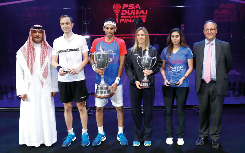 أبطال نهائيات دبي للسلسلة العالمية للإسكواش على منصة التتويج. من المصدر