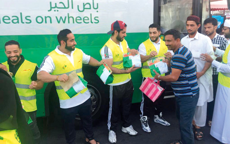 شارك لاعبو منتخب الامارات لبناء الأجسام والقوة البدنية في حملة «باص الخير الرمضانية»، بالتعاون والتنسيق مع هيئة الطرق والمواصلات، وذلك من خلال توزيع الطعام والماء لإفطار الصائمين خلال ايام شهر رمضان المبارك. وشارك في الحملة كلٌ من عضو مجلس الادارة مدير المنتخبات أحمد جوهر، وعضو العلاقات العامة في الاتحاد سرور غابش، والسكرتير الفني عبدالمجيد يزبك، وأبطال بطولتي آسيا للرجال والشباب أيوب رزوقي العمار وأحمد حسن رستم وبدر محمد وجاسم البلوشي وراشد الحبسي وهادف مطر وعبدالوهاب أحمد الأميري.