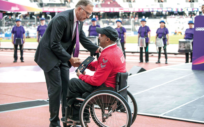 وقامت اللجنة المنظمة خلال الحفل بتكريم عبدالله، بميدالية الوفاء والتقدير، حيث تسلم التكريم أمين عام اتحاد المعاقين مدير البعثة ذيبان المهيري.