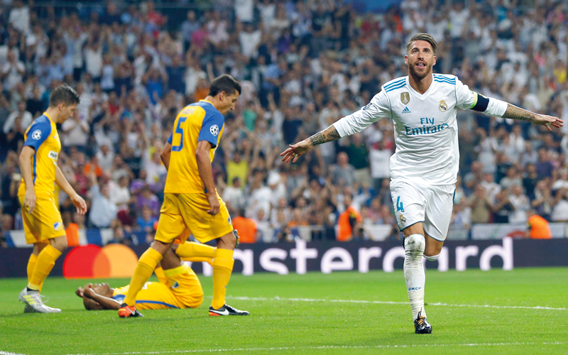 Real Madrid's Sergio Ramos celebrates scoring his side's 3rd goal during a Champions League group H soccer match between Real Madrid and Apoel Nicosia at the Santiago Bernabeu stadium in Madrid, Spain, Wednesday, Sept. 13, 2017. (AP Photo/Francisco Seco)