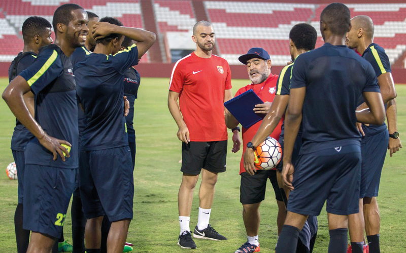 مارادونا يوجه لاعبي الفجيرة خلال التدريبات. من المصدر