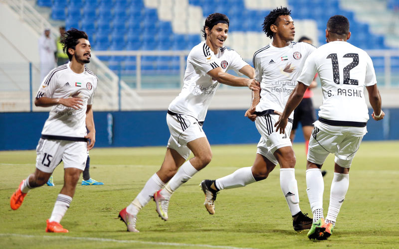 رومارينهو يحتفل مع زملائه بتسجيل الهدف الثالث في مرمى حتا. الإمارات اليوم