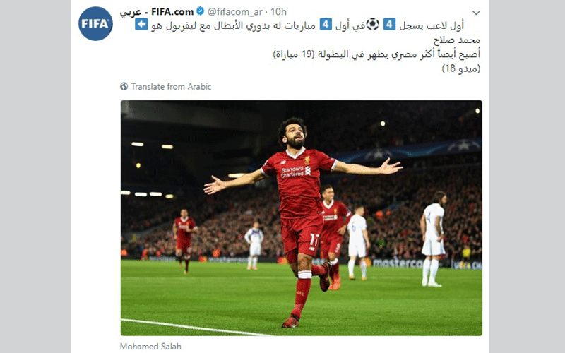 أشاد الاتحاد الدولي لكرة القدم "فيفا" على حسابه الرسمي على "تويتر"، بما قدمه النجم المصري الدولي محمد صلاح مع فريقه ليفربول الإنجليزي، خلال مباراته أمام ماريبور السلوفيني، في الجولة الرابعة للمجموعة الخامسة من دوري أبطال أوروبا، بعدما سجل هدفاً ضمن فوز الريدز 3 / 0.