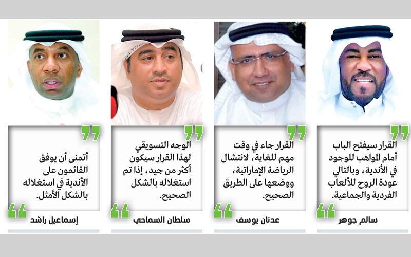 وأوضح لاعب منتخب الإمارات السابق، سالم جوهر، أن القرار سيفتح الباب أمام المواهب في جميع الألعاب، قائلاً: «كثيراً ما كنا نقابل لاعبين موهوبين، لكن لا يستطيعون الوجود بالأندية، ومع تطبيق هذا القرار سيفتح الباب أمامهم للوجود في الأندية، وبالتالي عودة الروح للألعاب الفردية والجماعية على حد سواء».