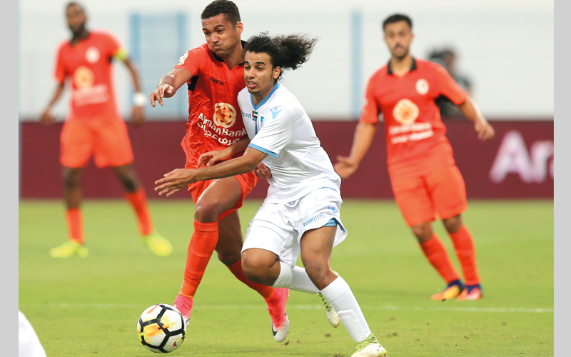 مهاجم عجمان أديلسون في صراع على الكرة مع لاعب حتا راشد جلال. من المصدر