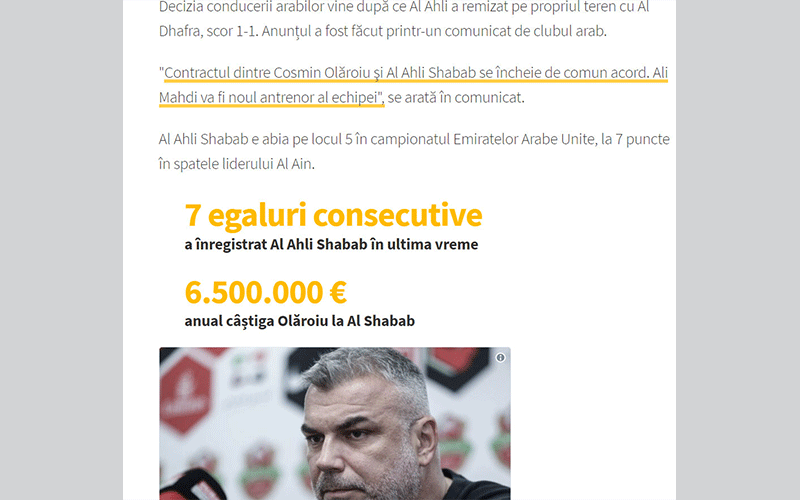 أبرزت وسائل الإعلام الرومانية خبر إقالة نادي شباب الأهلي-دبي، للمدرب الروماني أولاريو كوزمين أول من أمس من تدريب الفريق الأول لكرة القدم في النادي، حيث أكدت أن "القيصر" خسر الراتب الكبير الذي كان ينص عليه عقده مع النادي والبالغ 6.5 مليون يورو في السنة الأخيرة من عقده مع شباب الأهلي-دبي.