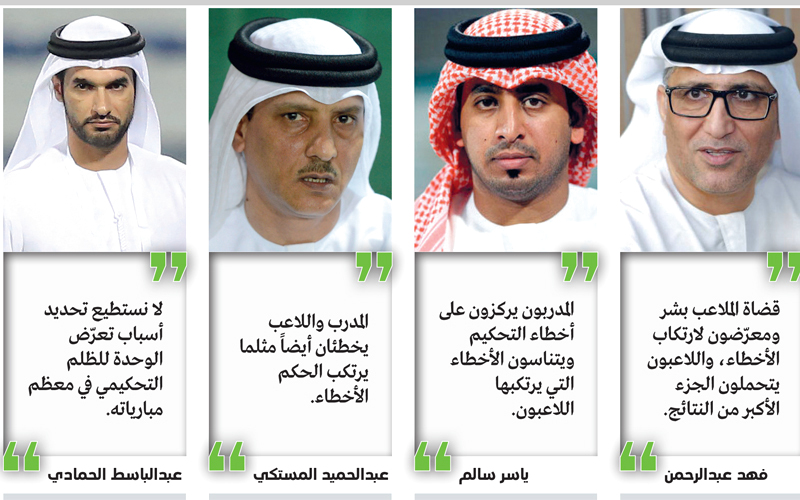 وقال مدير فريق الكرة بنادي الوحدة عبدالباسط محمد الحمادي: «الوحدة من أكثر الفرق تضرراً من أخطاء الحكام في معظم مبارياته، خصوصاً في مباراتي الوصل والعين اللتين خسرهما الفريق بأخطاء تحكيمية مؤثرة شهد بها الجميع، وتعرض فيهما لظلم واضح، والفريقان هما المنافسان للوحدة حتى الآن في قمة الدوري، واستفادا بالقطع من هذه الأخطاء، ولو لم تكن هذه الأخطاء التي تسببت في خسارة الوحدة لهاتين المباراتين لخرج الوحدة متعادلاً على أقل تقدير إن لم يكن هو الفائز بالنقاط الست لهما، ولتغير موقع الفريق الآن في جدول ترتيب المسابقة، وصعد إلى قمة الدوري التي كان الأحق بها طوال الفترة الماضية، وفي الوقت نفسه كان منافساه الوصل والعين قد خسر كل منهما نقطتين على أقل تقدير».