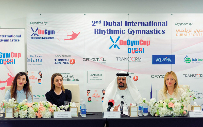 جانب من المؤتمر الصحافي للكشف عن تفاصيل بطولة دبي الدولية للجمباز الإيقاعي. من المصدر