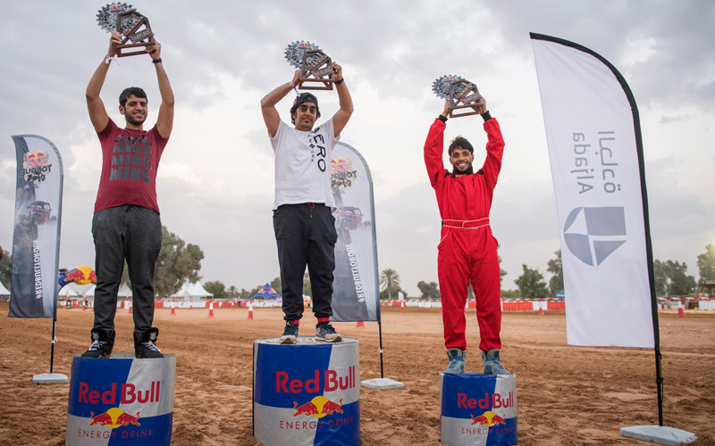 من مراسم تتويج الفائزين بالمراكز الثلاثة الأولى لسباق «ريد بل تورك». من المصدر