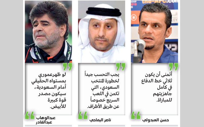 من جهته، شدد مدرب عجمان وبني ياس السابق العراقي عبدالوهاب عبدالقادر، على أن الأبيض سيواجه مهمة صعبة أمام المنتخب السعودي، لافتاً الى أهمية تحكم «الأبيض» في منطقة الوسط من خلال زيادة الكثافة العددية ونقل الكرات في الملعب بكل سهولة، وذلك حتى لا يتمكن المنتخب السعودي من السيطرة على منطقة الوسط، معتبراً أنه يجب أيضاً على لاعبي الأبيض عدم ترك أي مساحات خالية خلف المدافعين، قد يستغلها المنتخب السعودي في تهديد مرمى الأبيض.