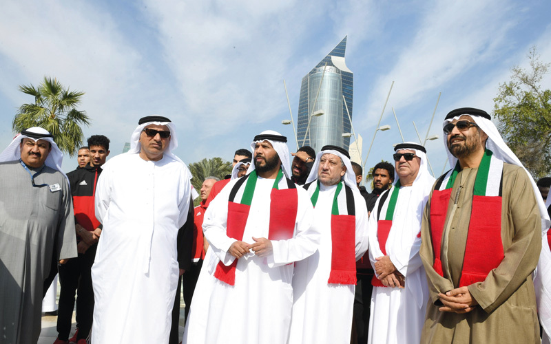 قام المنتخب الوطني لكرة القدم بزيارة صباح أمس، للنصب التذكاري لشهداء الكويت، الموجود في حديقة الشهيد بالعاصمة الكويتية، حيث تواجد في الزيارة، أعضاء مجلس إدارة اتحاد الكرة برئاسة مروان بن غليطة، وسفير الدولة لدى دولة الكويت رحمة حسين الزعابي، وأعضاء الجهازين الإداري والفني ولاعبو المنتخب. وحرص اللاعبون على التقاط الصور مع مجموعة من أبناء الشهداء الذين تصادف وجودهم في حديقة الشهيد.