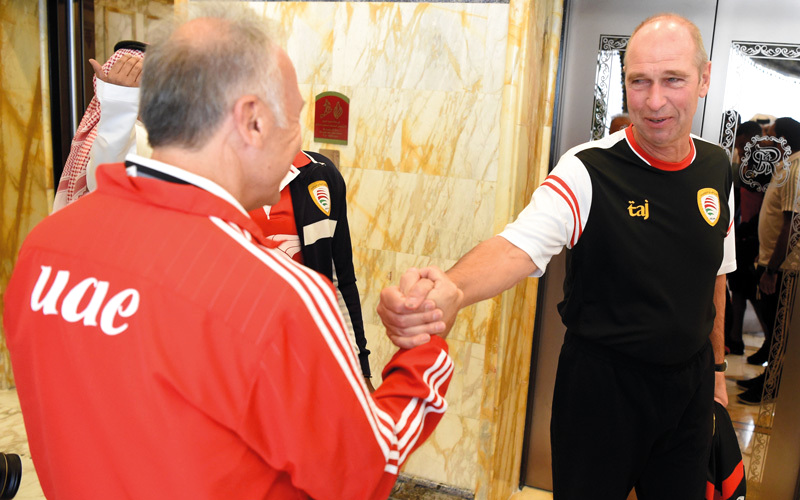 تصافح مدرب المنتخب الوطني، الإيطالي ألبيرتو زاكيروني مع نظيره مدرب عمان، الهولندي بيم فيربيك، على هامش المؤتمر الصحافي الخاص بالمباراة النهائية التي تجمعهما، اليوم، على لقب كأس الخليج الـ23 المقامة حالياً في الكويت، والأمل يحدوهما بنيل اللقب الغالي.