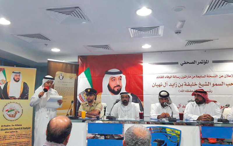 وأعلن رئيس اللجنة المنظمة، صالح محمد حسن، أن حملة «رسالة الوفاء للقائد» تجمع 77 دولة وجنسية من مختلف دول العالم، سيشاركون في حمل الرسالة بشكل تتابعي، مروراً بجميع إمارات الدولة، في كل من الفجيرة ورأس الخيمة وأم القيوين وعجمان والشارقة ودبي، وصولاً للعاصمة أبوظبي.